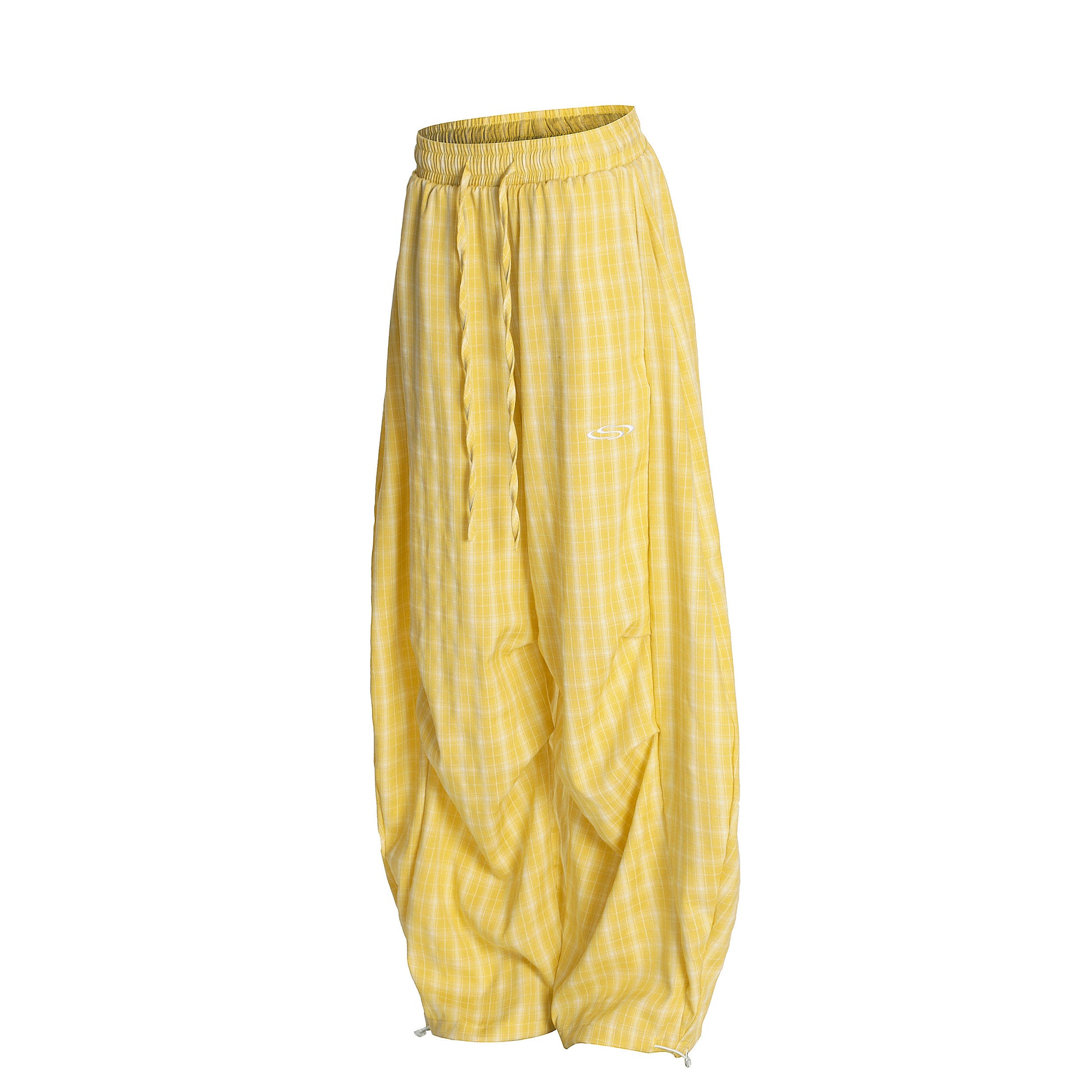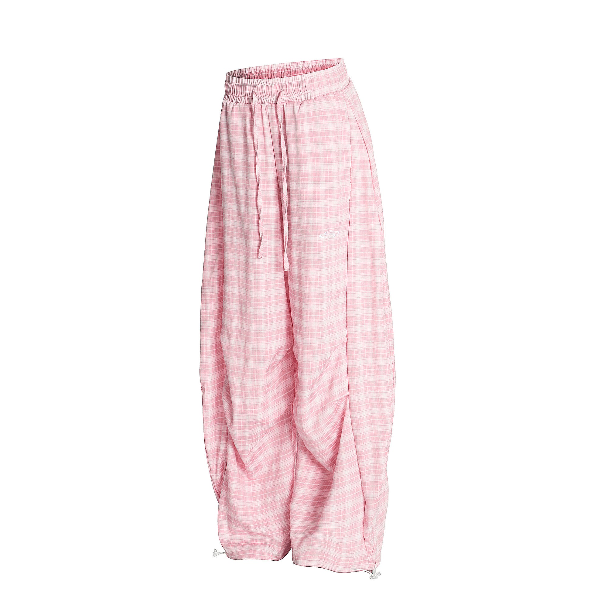 Relaxed fit plaid joggers with a ruched hem and adjustable drawcord. Lightweight feel and roomy cut perfect for streetwear comfort.