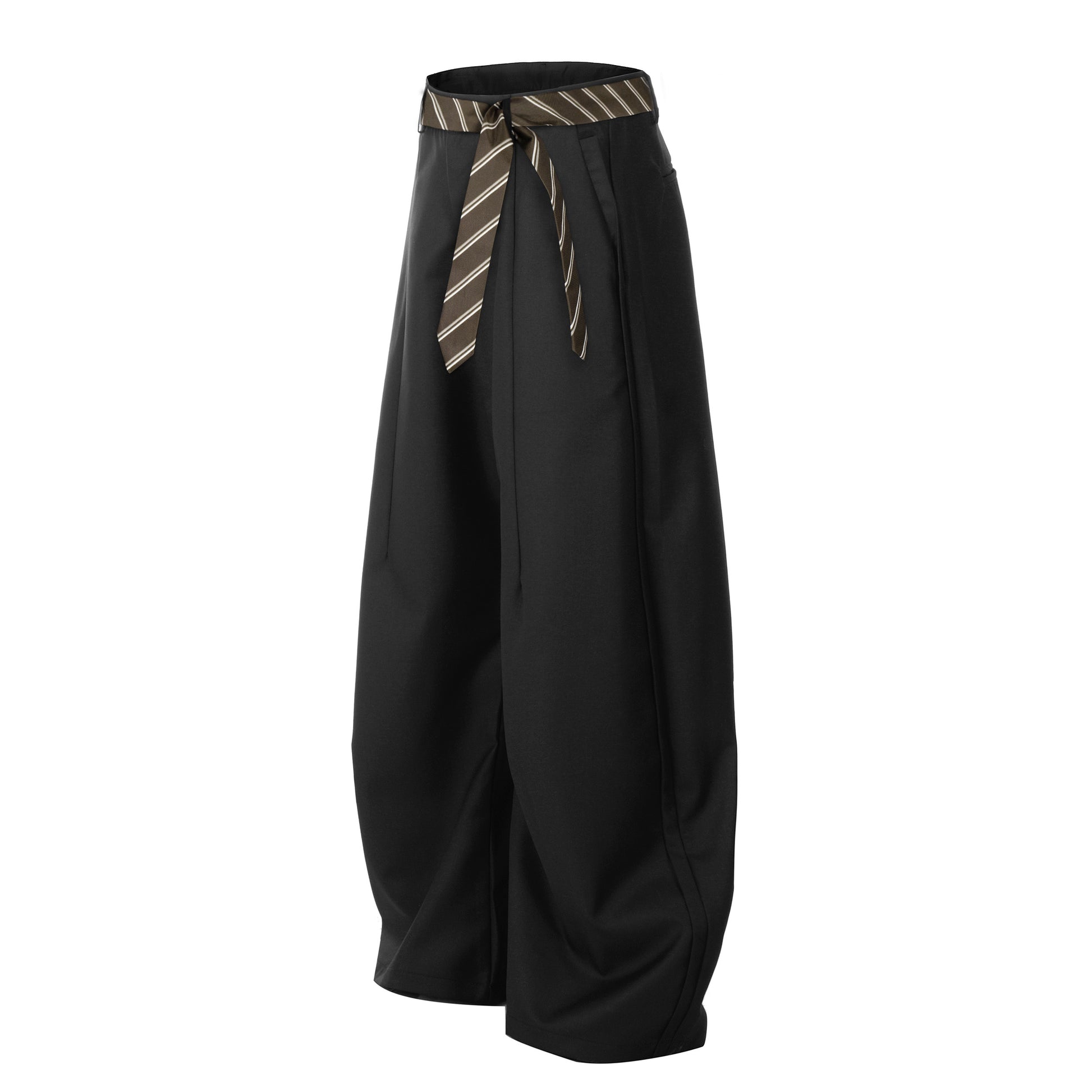 Polished yet playful, these tailored wide-leg trousers feature a striped necktie-style belt. A unique blend of formal flair and street-ready edge.