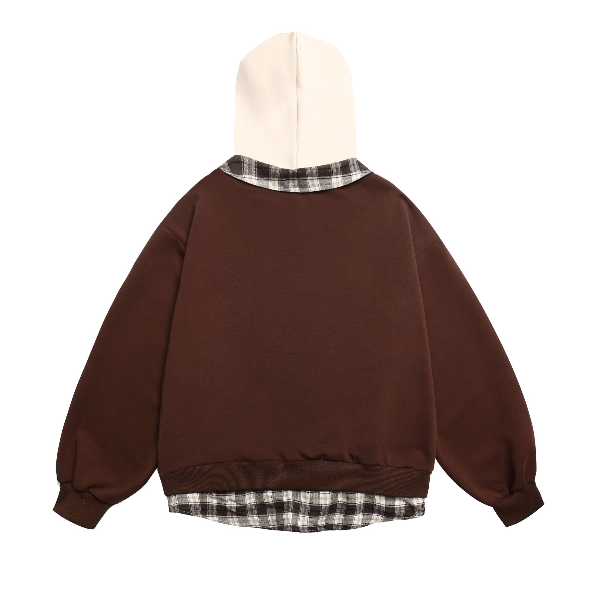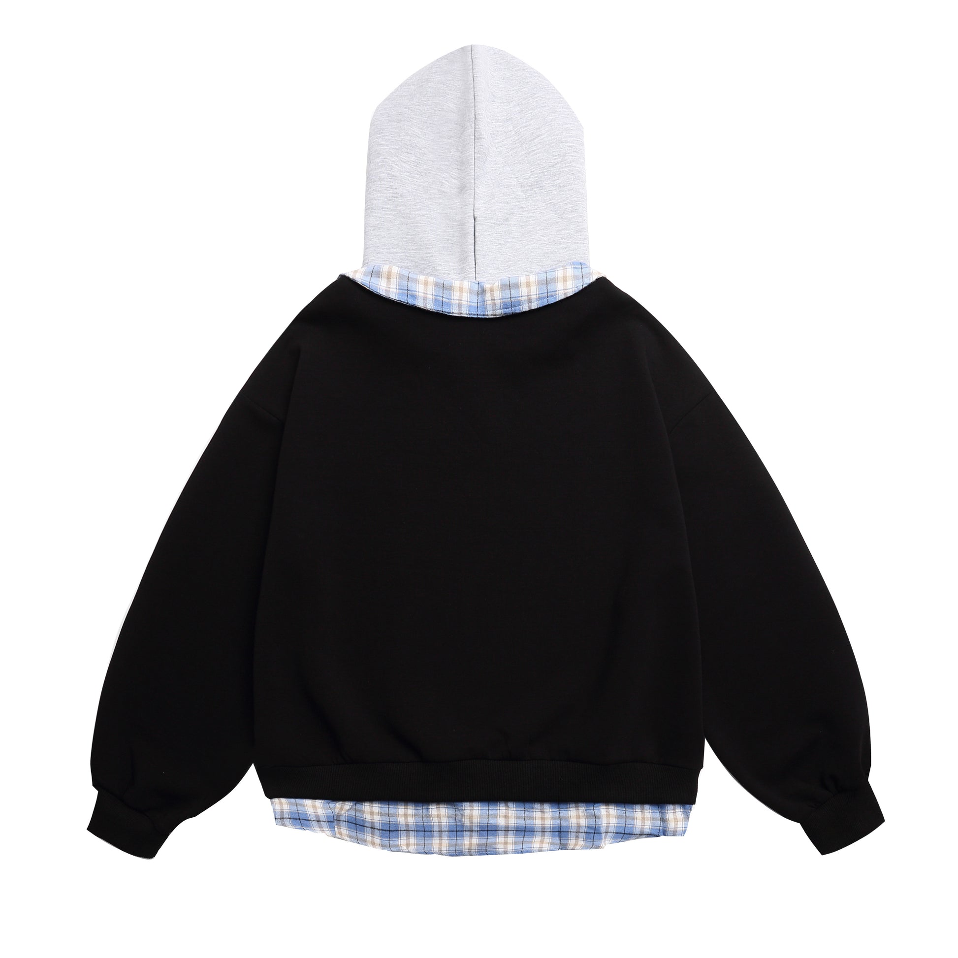 This vintage-inspired hoodie fuses sporty prints with a clever layered look. Featuring a built-in plaid collar and dual hood, it brings a bold twist to classic streetwear.