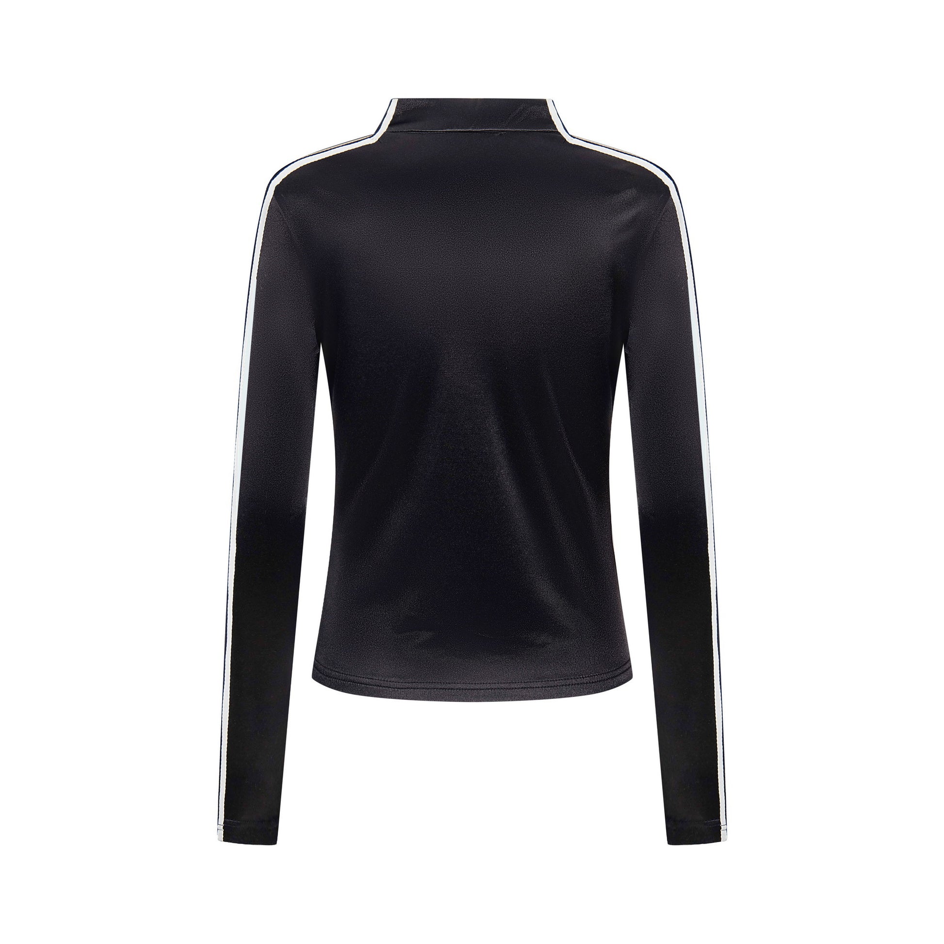 Glossy finish meets lace-up neckline in this varsity-inspired top with bold club lettering. Athletic yet elevated, it’s perfect for standout casual wear.