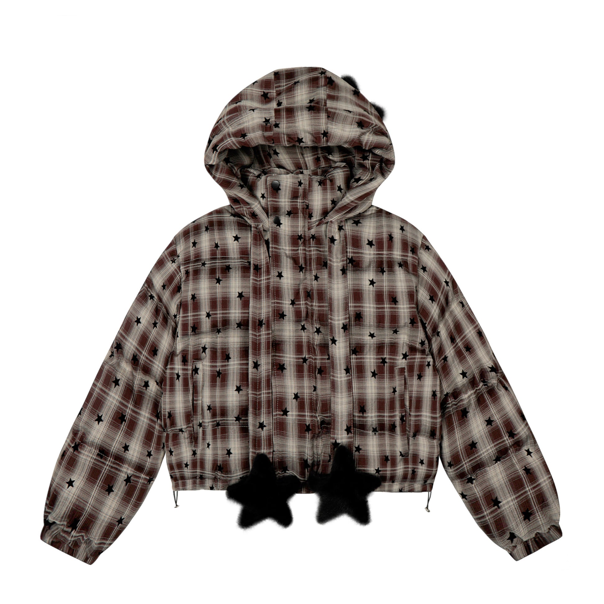 A bold plaid base with scattered black stars and fluffy hem stars brings edgy fun to this cropped hoodie. Made for standout layering with playful flair.